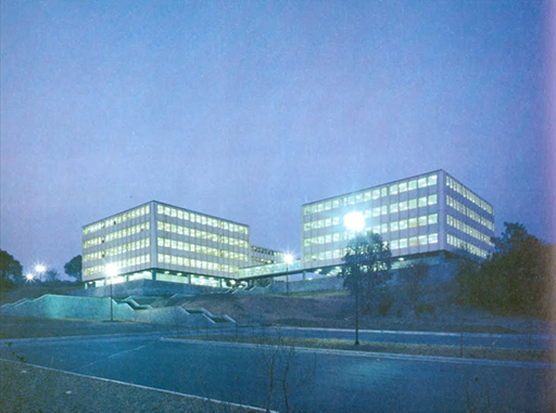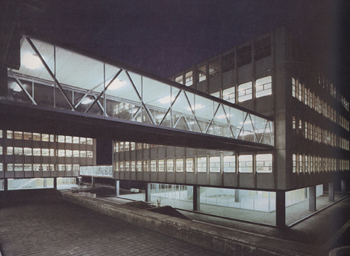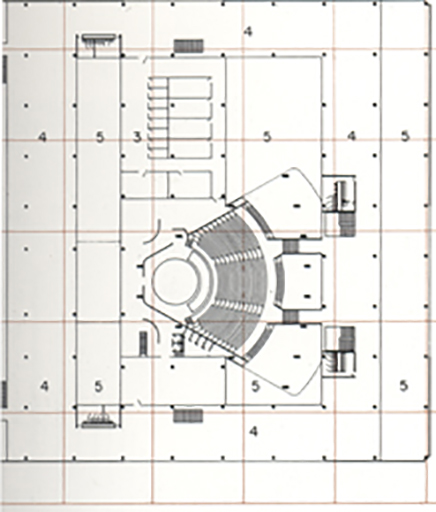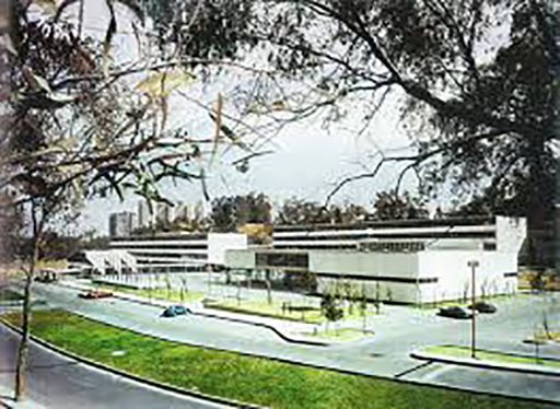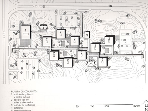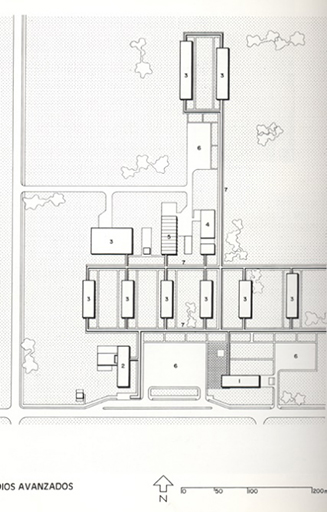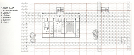 Localizan las funciones administrativas y un auditorio. Casda edificio es autónomo en sus