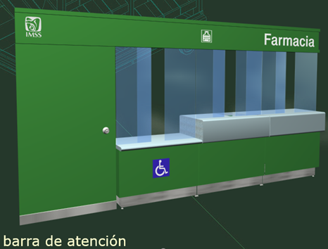 Para la barra de atención, que es el lugar donde a la población derechohabiente se le surten sus recetas, partimos de un diseño basado en módulos horizontales de 90 centímetros, de los cuales cada unidad médica pediría los necesarios de acuerdo con sus medidas. Como no todas las farmacias tendrían dimensiones correspondientes a esta modulación, se envió un módulo más para ser adaptado por el personal de conservación a las dimensiones requeridas, con un instructivo de aplicación.